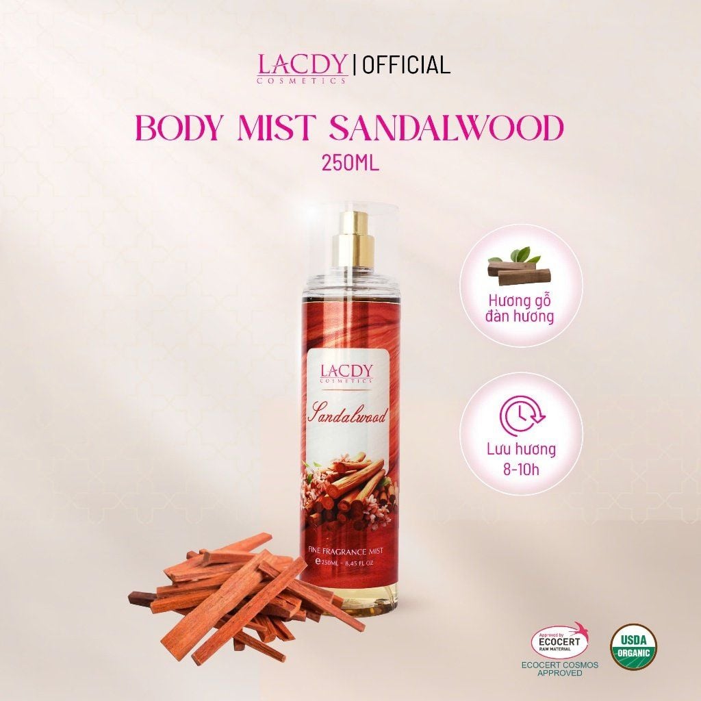 Body Mist nam Sandalwood là sản phẩm được sản xuất bởi thương hiệu Lacdy, với nguyên liệu đạt chứng nhận chất lượng từ Ecocert & FDA Hoa Kỳ.