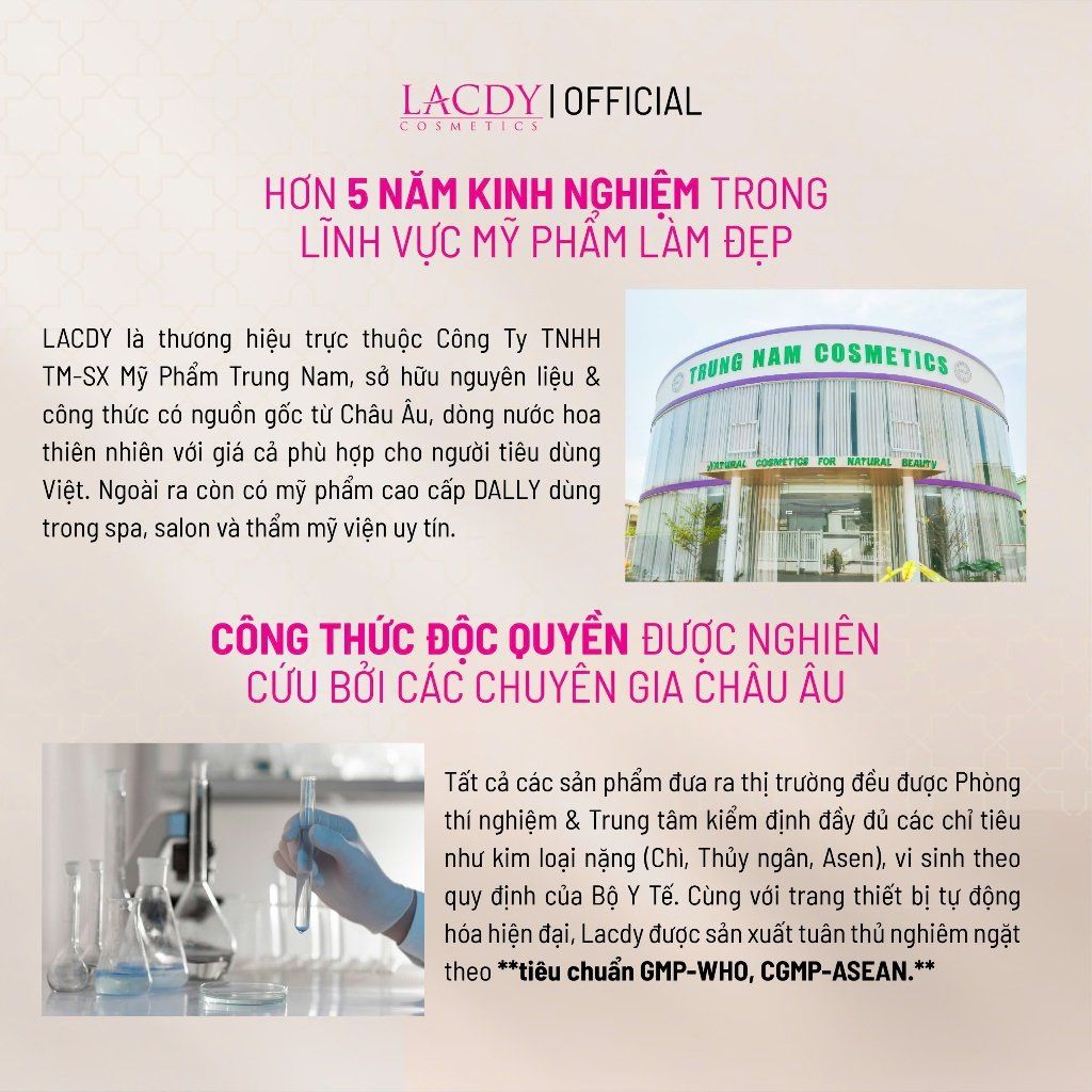 Tất cả các sản phẩm đưa ra thị trường đều được Phòng thí nghiệm & Trung tâm kiểm định đầy đủ các chỉ tiêu như kim loại nặng (Chì, Thủy ngân, Asen), vi sinh theo quy định của Bộ Y Tế. Cùng với trang thiết bị tự động hóa hiện đại, Lacdy được sản xuất tuân thủ nghiêm ngặt theo tiêu chuẩn GMP-WHO, CGMP-ASEAN.